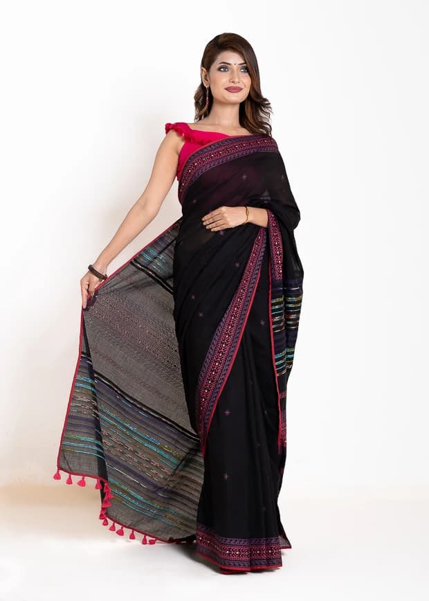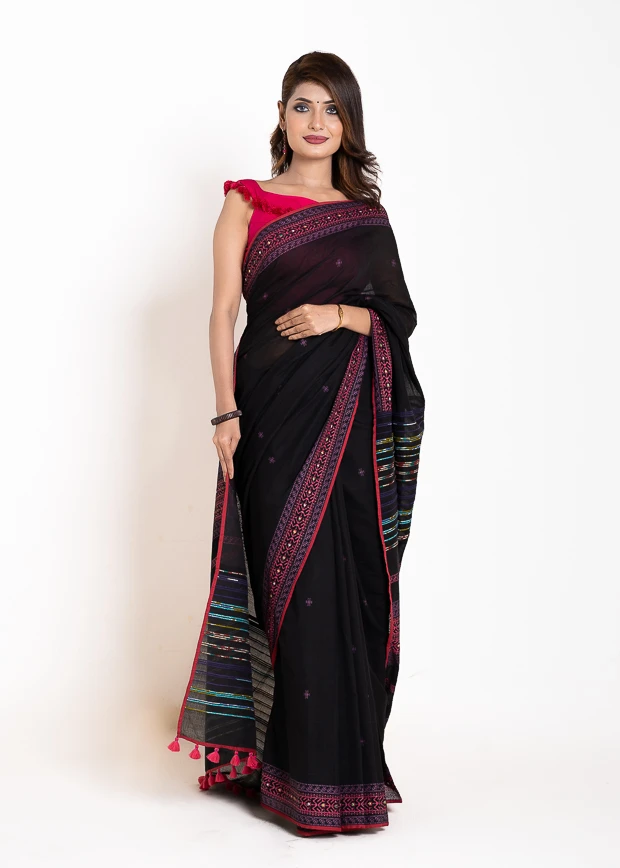 Make a bold and elegant statement with this stunning black cotton saree, crafted from soft and breathable fabric for all-day comfort. Featuring heavy work on the achal (pallu) and along the sides, it offers a rich and eye-catching look that enhances its overall sophistication. Perfect for festive occasions, evening events, and special celebrations, this saree beautifully blends comfort with timeless style.