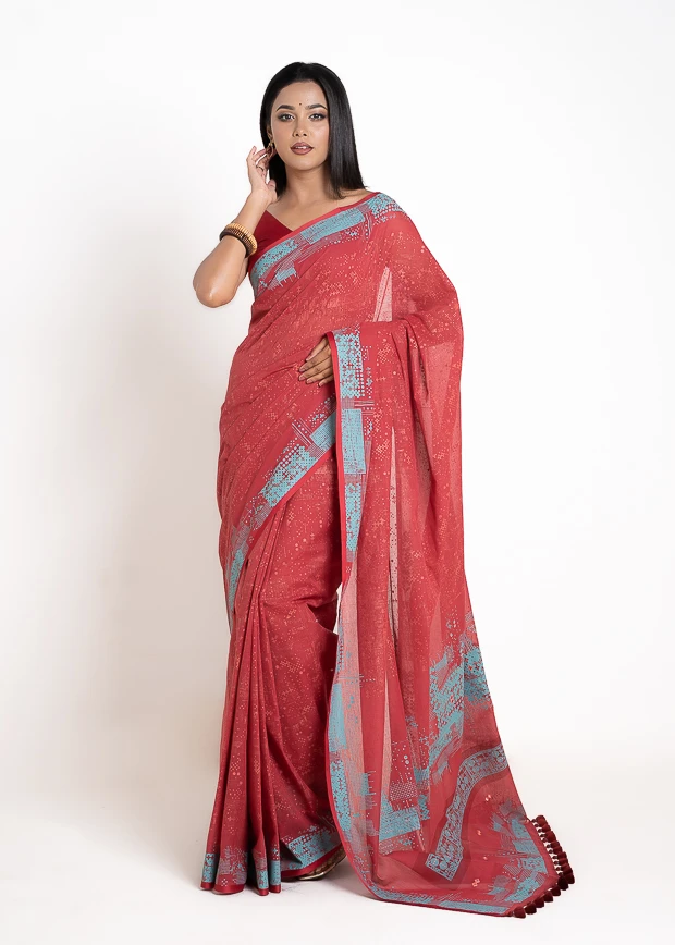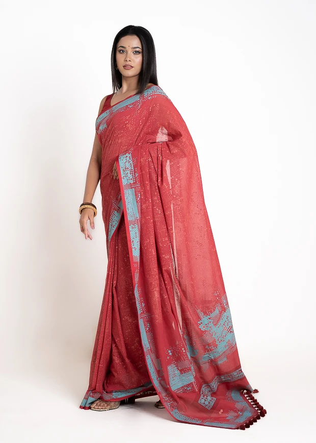 Cotton Saree-Flame Red