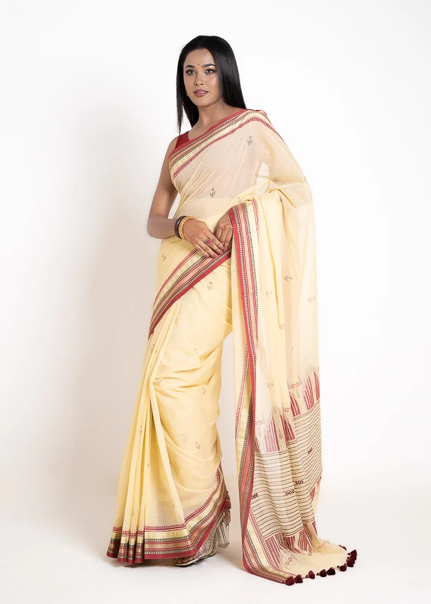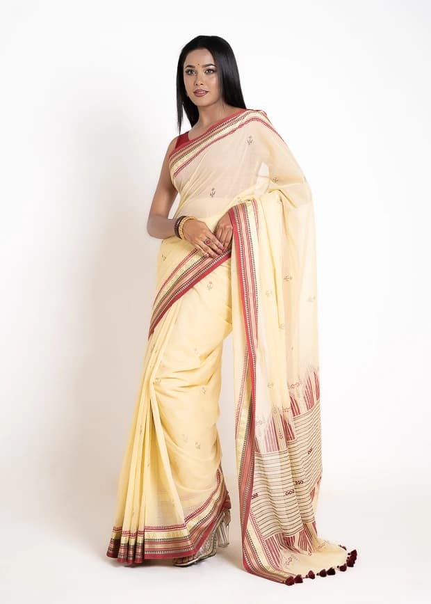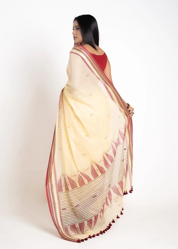Add a touch of understated elegance with this off-white cotton saree, crafted from soft and breathable fabric for all-day comfort. Featuring intricate work on the achal (pallu) and delicate detailing along the sides, it exudes a graceful and sophisticated charm. Lightweight and versatile, this saree is perfect for celebrations, festive occasions, and family gatherings.