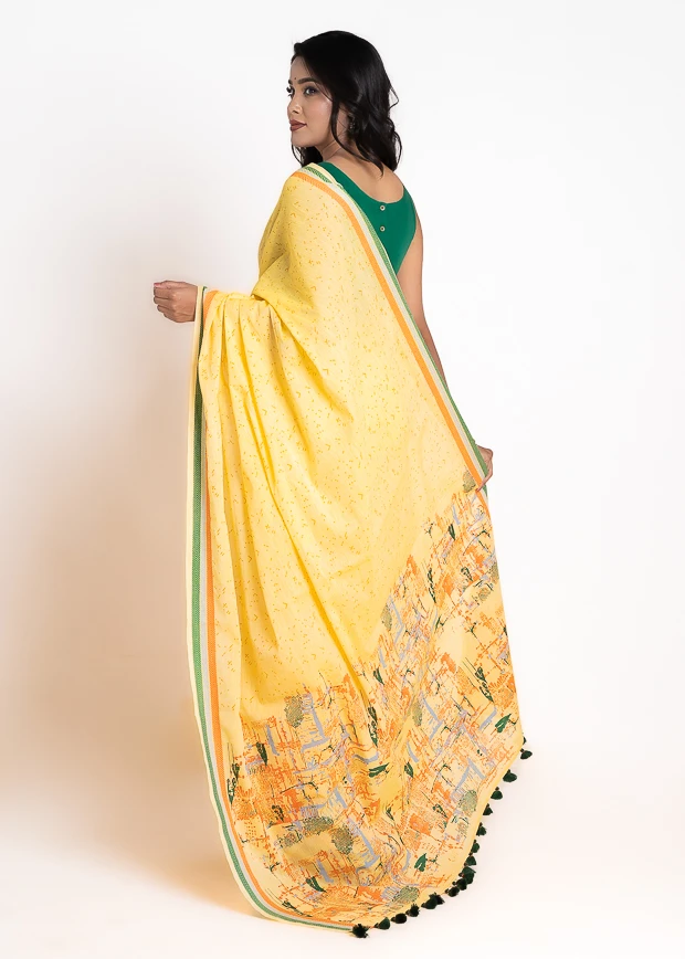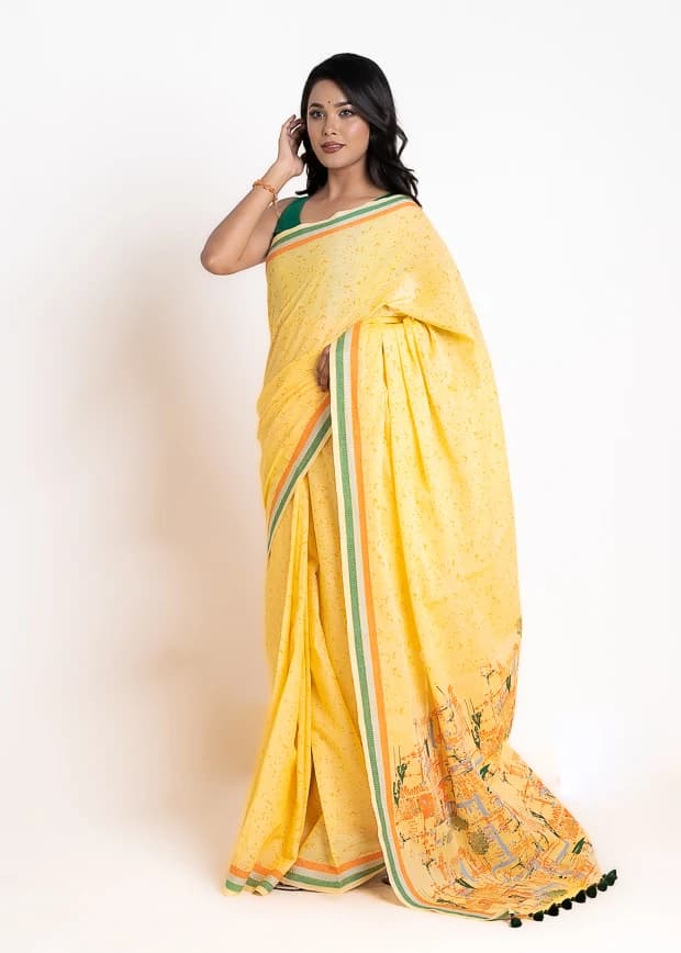 Brighten up your look with this elegant yellow cotton saree, crafted from soft and breathable fabric for all-day comfort. Featuring beautiful work on the achal (pallu), it adds a graceful and stylish touch to the overall design. Lightweight yet eye-catching, this saree is perfect for any celebration, festive occasion, or family gathering.
