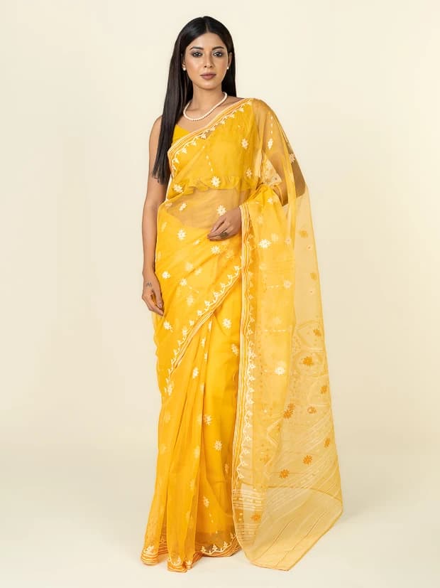 Make a statement with this stunning Jamdani saree, featuring exquisite and detailed work all over. Crafted with precision and elegance, it radiates sophistication and festive charm. Perfect for celebrations, weddings, and special occasions, this saree combines traditional artistry with timeless style for a truly graceful look.