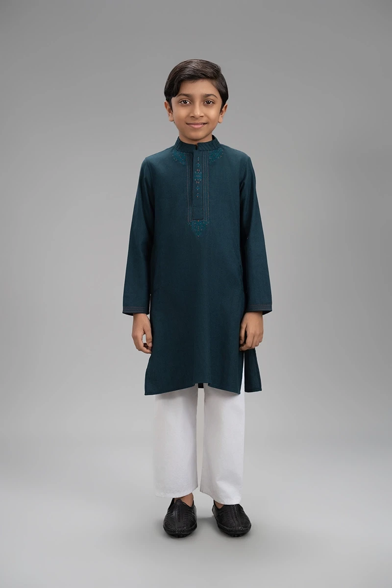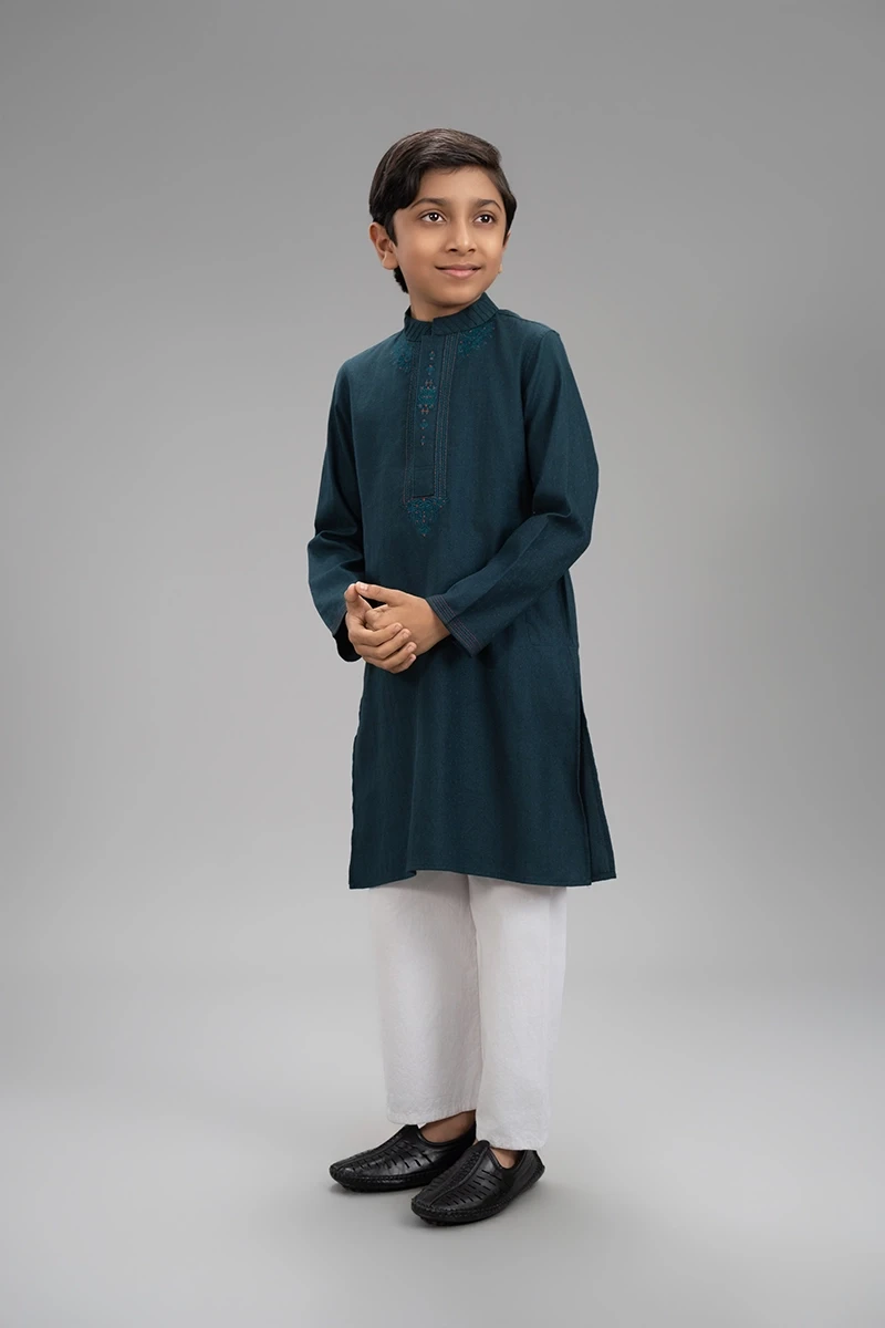 Green Sprout Muffin Bite Green Hand Work Kids Boys Panjabi is crafted from premium Endi Cotton for a soft, breathable, and comfortable feel. Designed especially for boys, this stylish Panjabi features elegant hand work detailing that adds charm and sophistication. The fine craftsmanship on the button placket and collar placket enhances its refined appeal. Perfect for festive occasions and special gatherings, this Panjabi offers a rich, premium look while ensuring all-day comfort for your little one.
