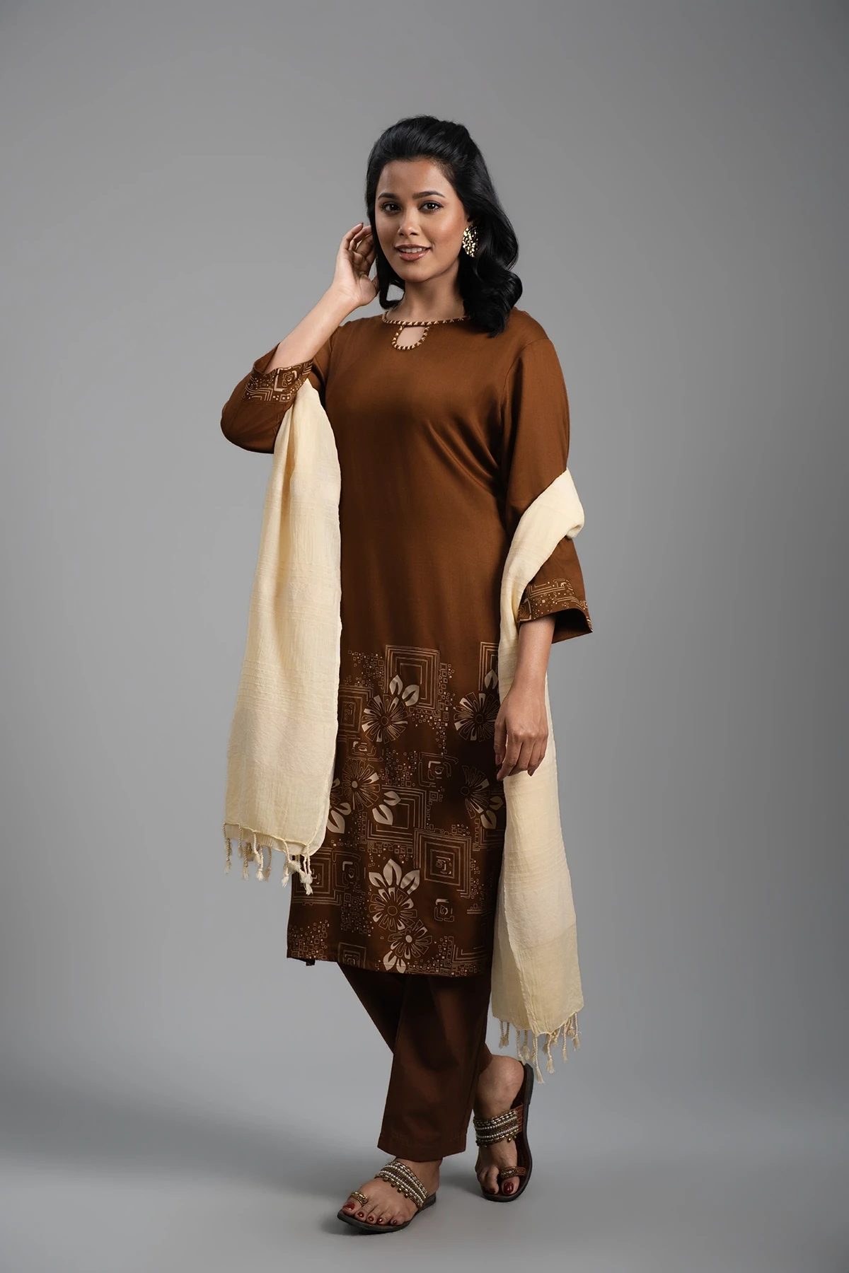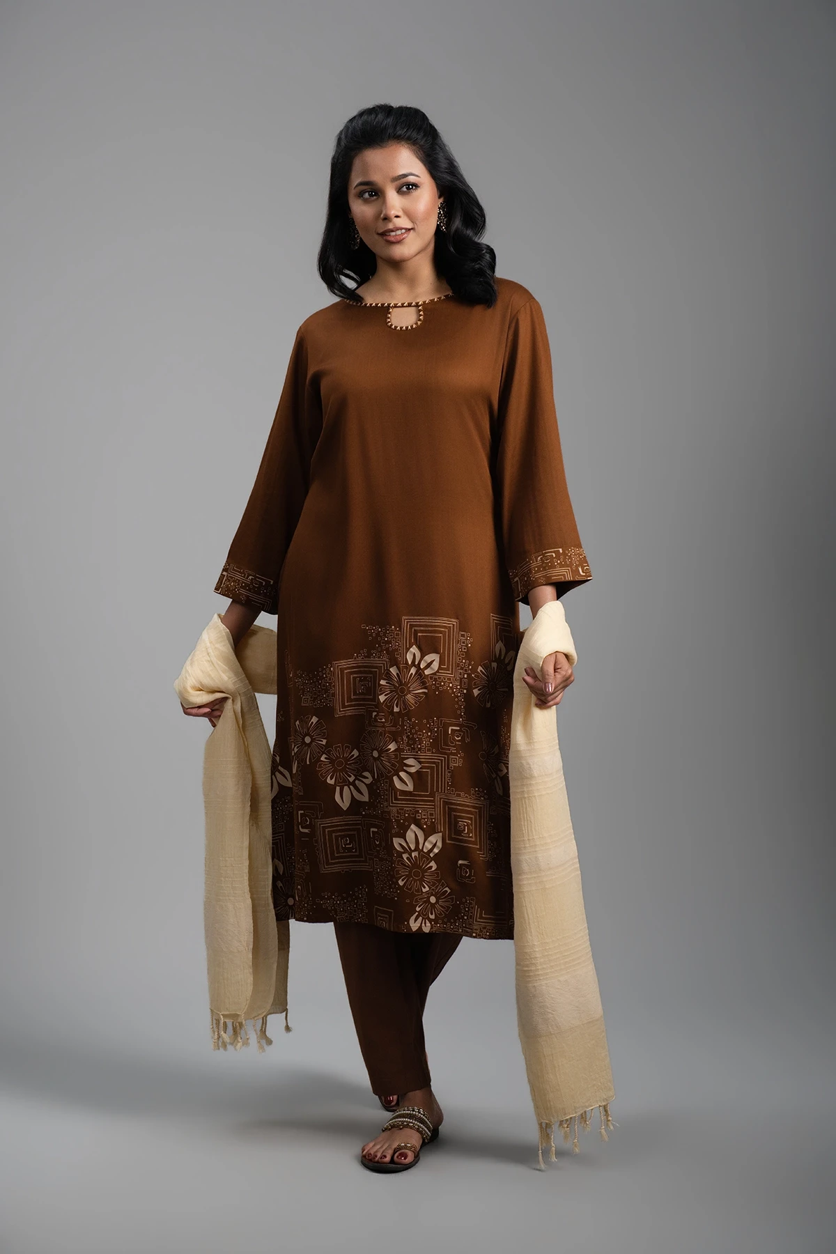 Discover timeless elegance with this brown kamij, featuring delicate print work on the lower hem and cuffs, complemented by intricate hand detailing on the neckline for a sophisticated finish. Paired with a matching brown bottom and an off-white dupatta, this ensemble exudes a premium and refined look. Perfect for formal gatherings, festive events, or special occasions, this outfit blends traditional craftsmanship with modern style, making it a must-have for those seeking grace and understated luxury in their ethnic wardrobe.