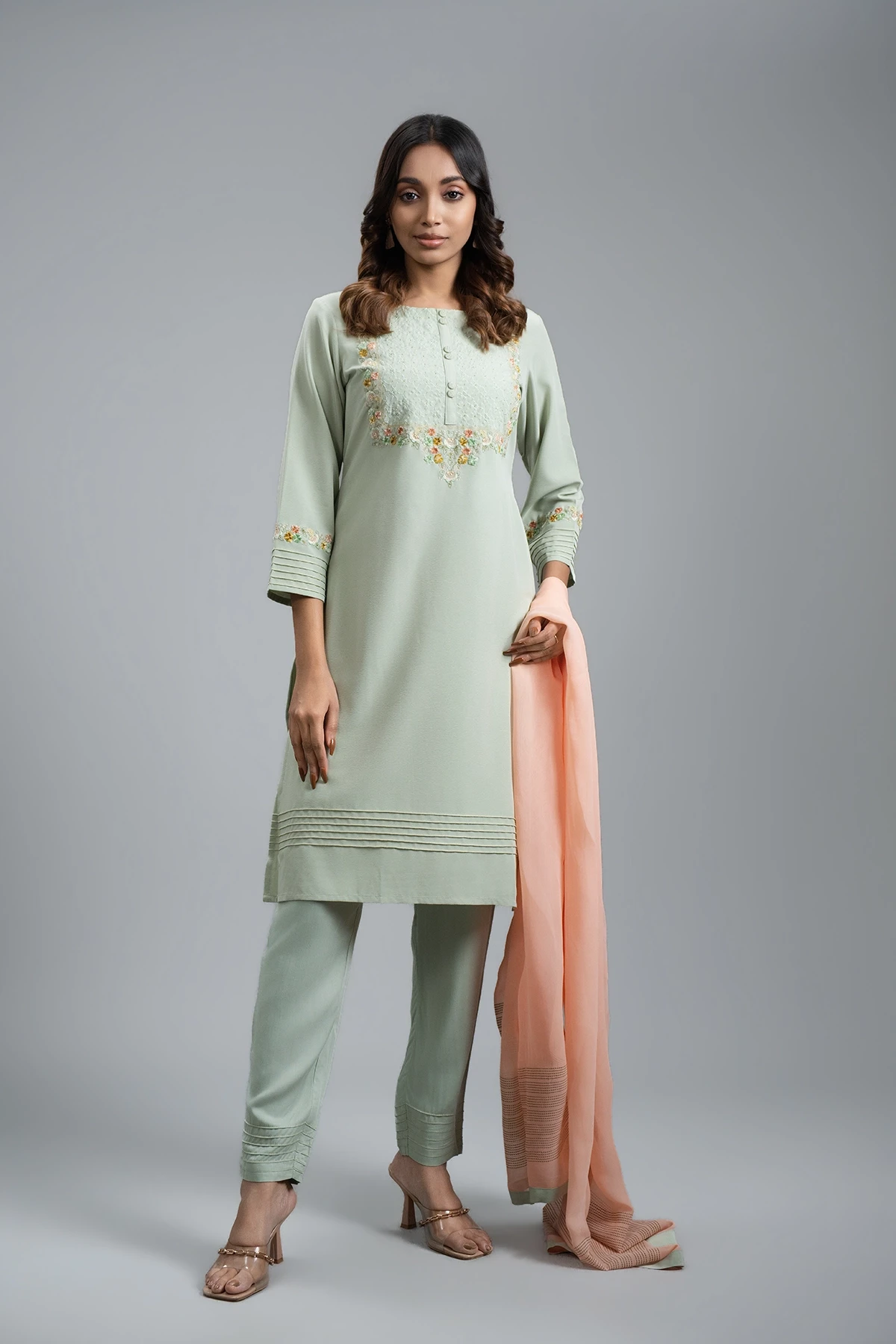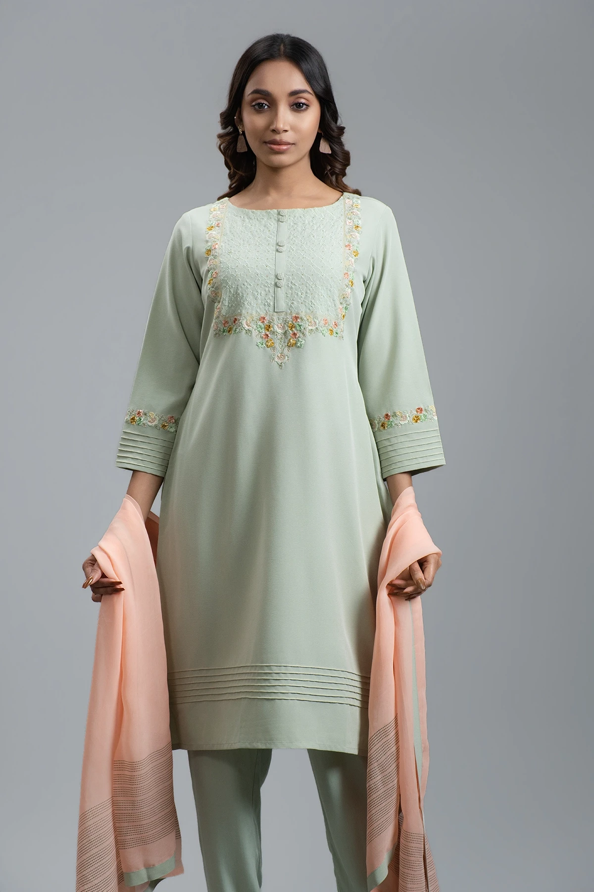 Step into elegance with this Turquoise Blue Kamij, featuring exquisite handwork on the front and sleeves for a refined, premium look. Designed with attention to detail, it comes with a perfectly matching bottom that complements the vibrant hue. The ensemble is paired with a soft light orange dupatta, adding a subtle contrast and enhancing its sophisticated appeal. Perfect for formal gatherings, festive celebrations, or special occasions, this outfit combines traditional charm with a luxurious, contemporary style.