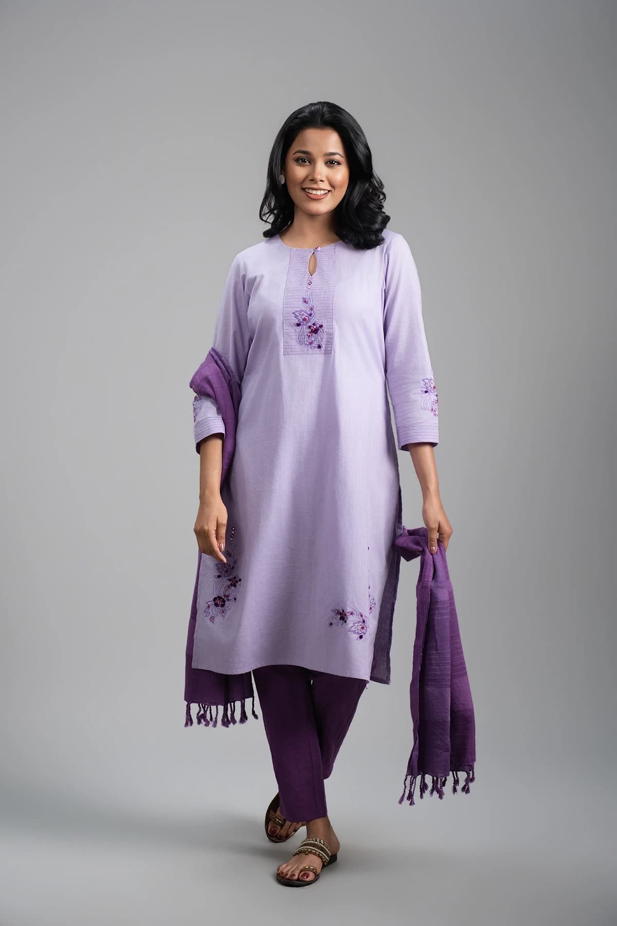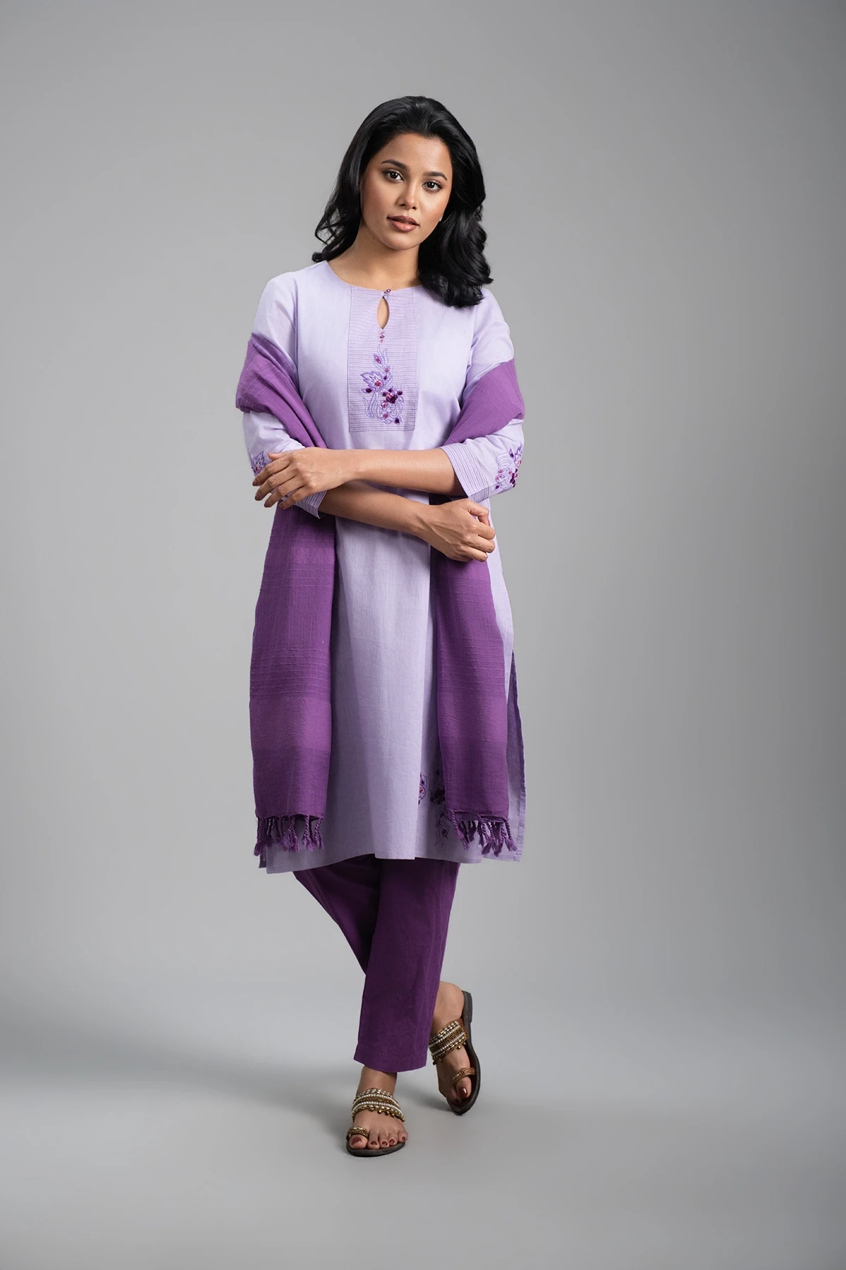 Step into elegance with this Lavender Kamij, designed to offer a premium and sophisticated look. The front features delicate handwork that adds subtle charm and refinement. It comes with a deep lavender bottom and a matching deep lavender dupatta, creating a harmonious and graceful ensemble. Perfect for formal gatherings, special occasions, or cultural events, this outfit combines timeless style with contemporary elegance, making it a must-have for anyone seeking a polished and luxurious ethnic look.