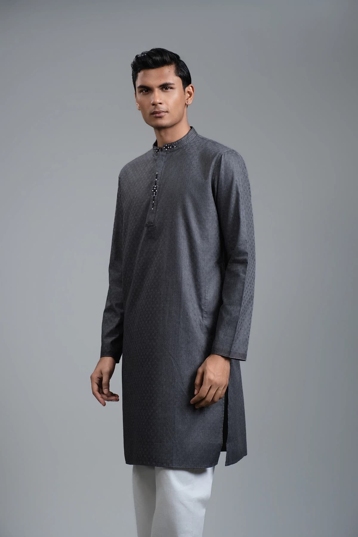 This Grey Panjabi combines minimal elegance with festive sophistication. The refined grey shade offers a timeless and versatile appeal, while subtle work on the collar placket and bottom placket showcases meticulous craftsmanship. Tailored for a comfortable yet structured fit, it delivers a polished and versatile look—perfect for celebrations as well as stylish everyday wear.