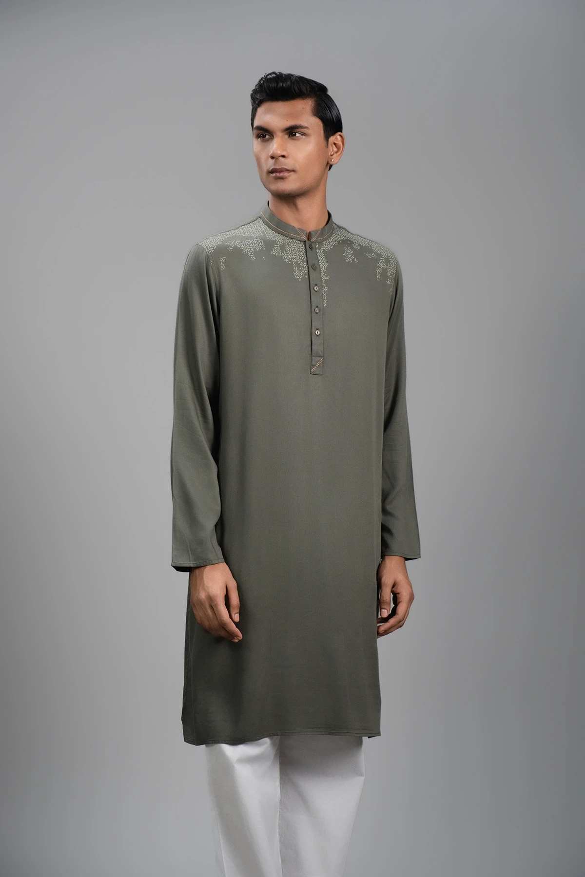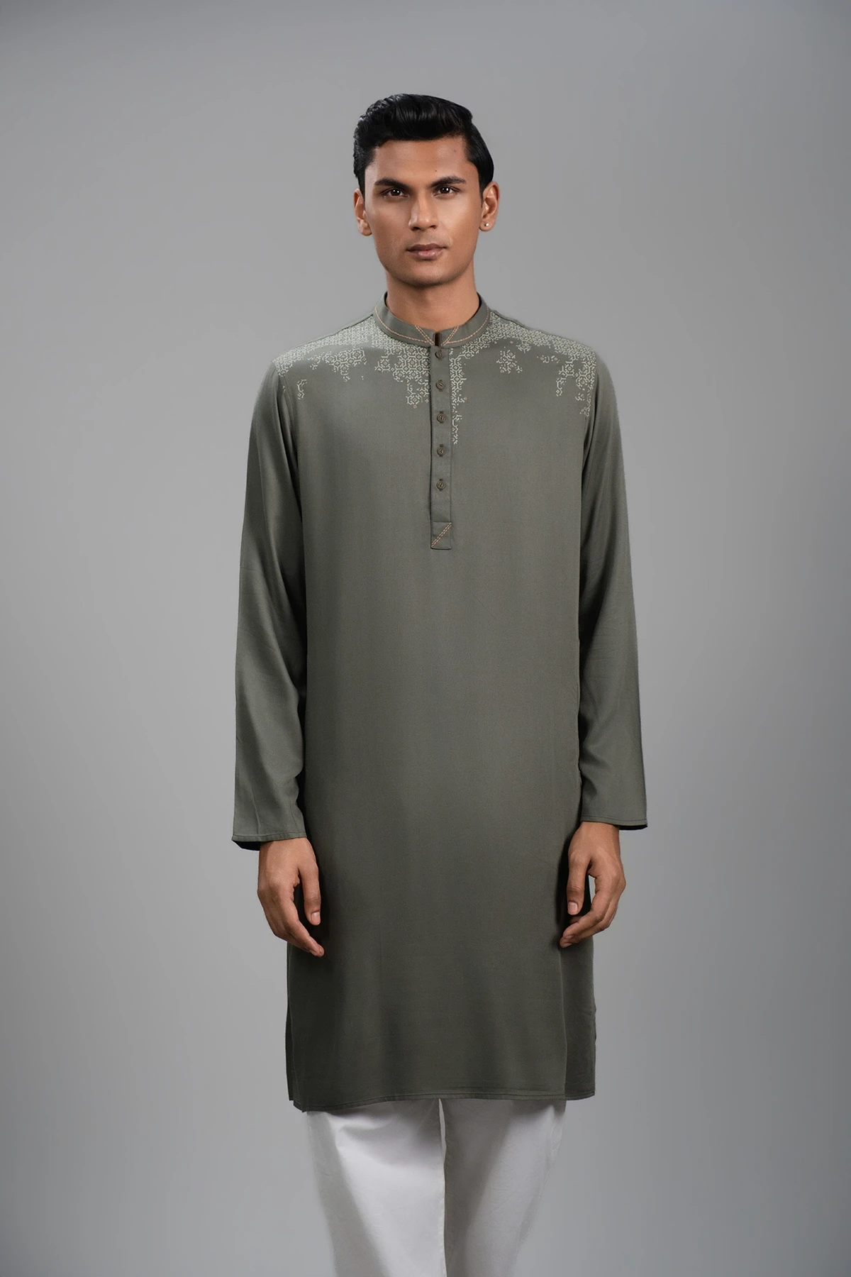 This Olive Panjabi combines minimal elegance with festive sophistication. The rich olive shade offers a refined and versatile appeal, while subtle work on the collar placket highlights expert craftsmanship. Tailored for a comfortable yet structured fit, it delivers a polished look—perfect for celebrations as well as stylish everyday wear.
