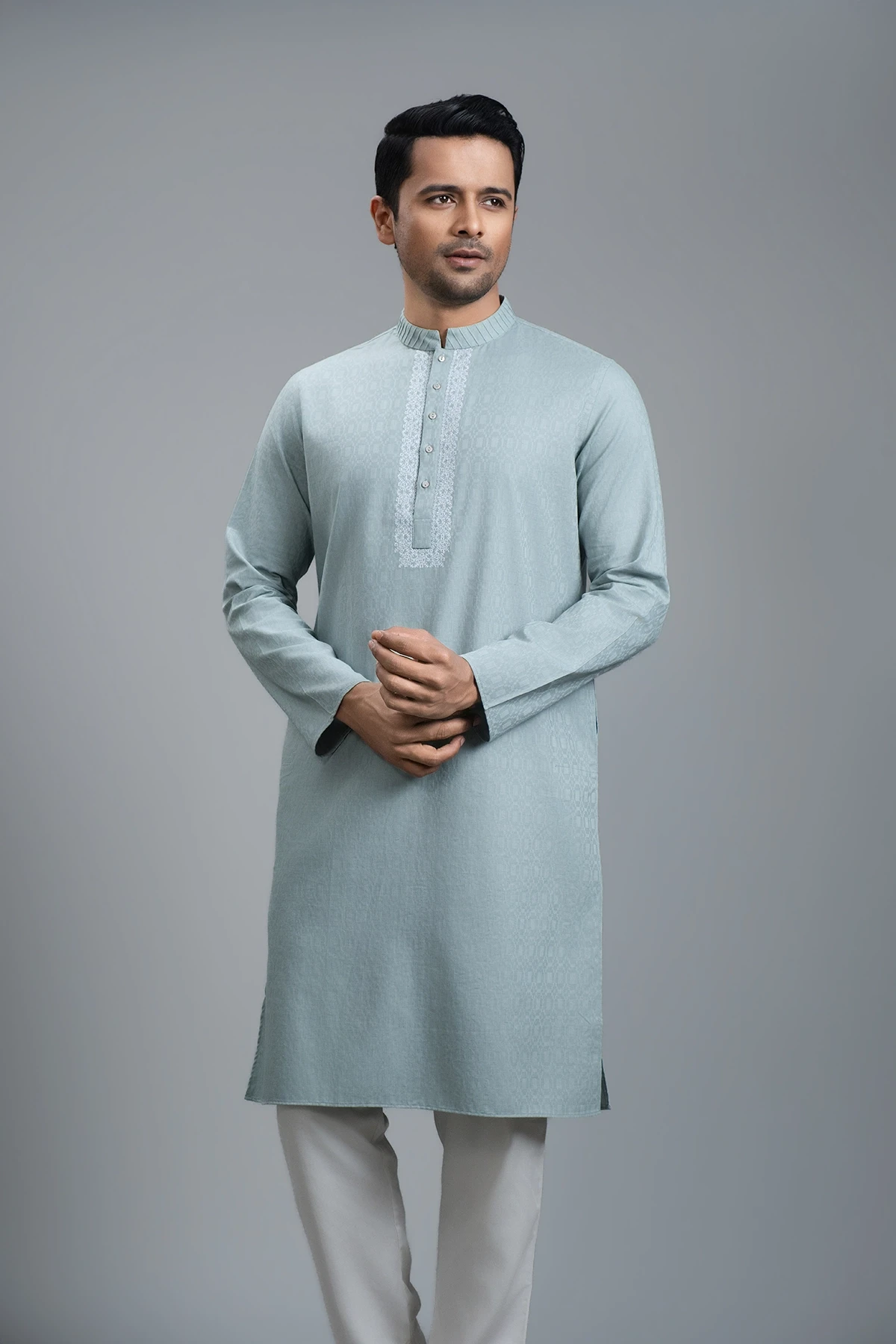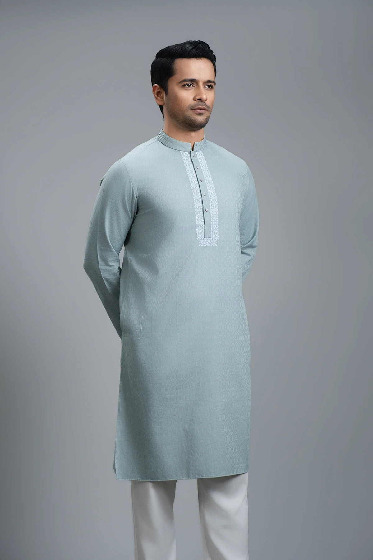This Teal Green Panjabi combines minimal elegance with festive charm. The rich teal green shade offers a sophisticated and refreshing appeal, while subtle work on the collar placket and body highlights refined craftsmanship. Expertly tailored for a comfortable yet structured fit, it delivers a polished, versatile look—perfect for celebrations as well as stylish everyday wear.