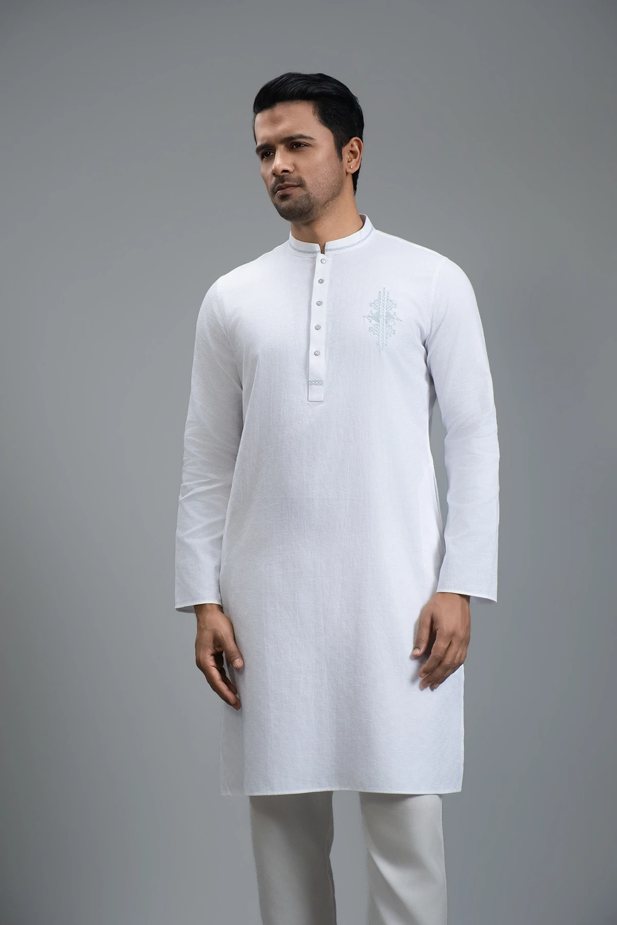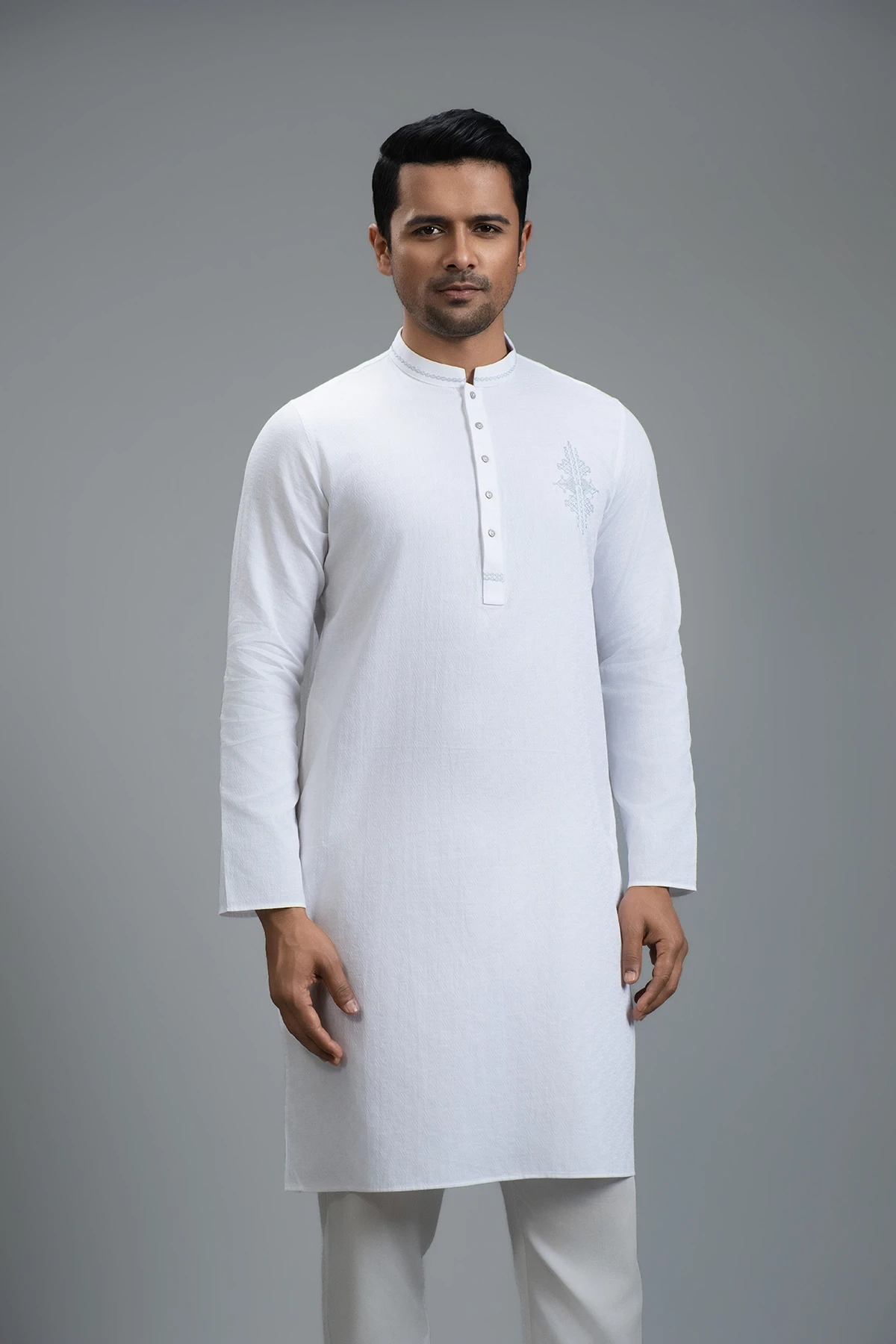 This White Panjabi perfectly balances minimal elegance with festive sophistication. Its crisp white shade exudes timeless charm, while delicate work on the button placket, collar placket, and body adds refined detailing. Expertly tailored for a comfortable yet structured fit, it delivers a polished, versatile look ideal for celebrations or stylish everyday wear.
