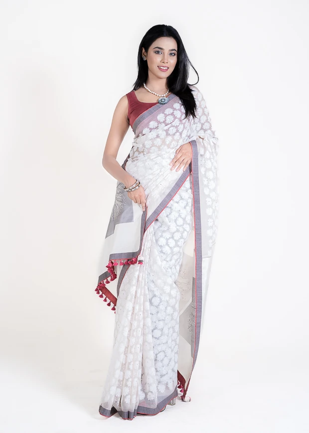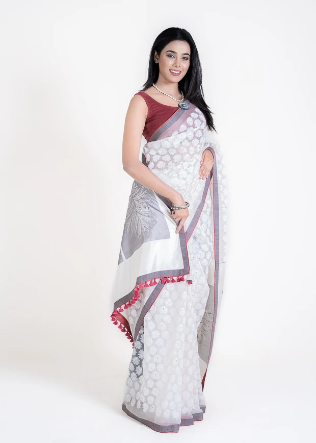 Elevate your elegance with this off-white muslin saree, featuring exquisite work at the achal. Its lightweight, airy texture makes it perfect for daytime events or casual celebrations, offering a blend of comfort and timeless grace. Ideal for those who appreciate subtle sophistication and delicate craftsmanship.