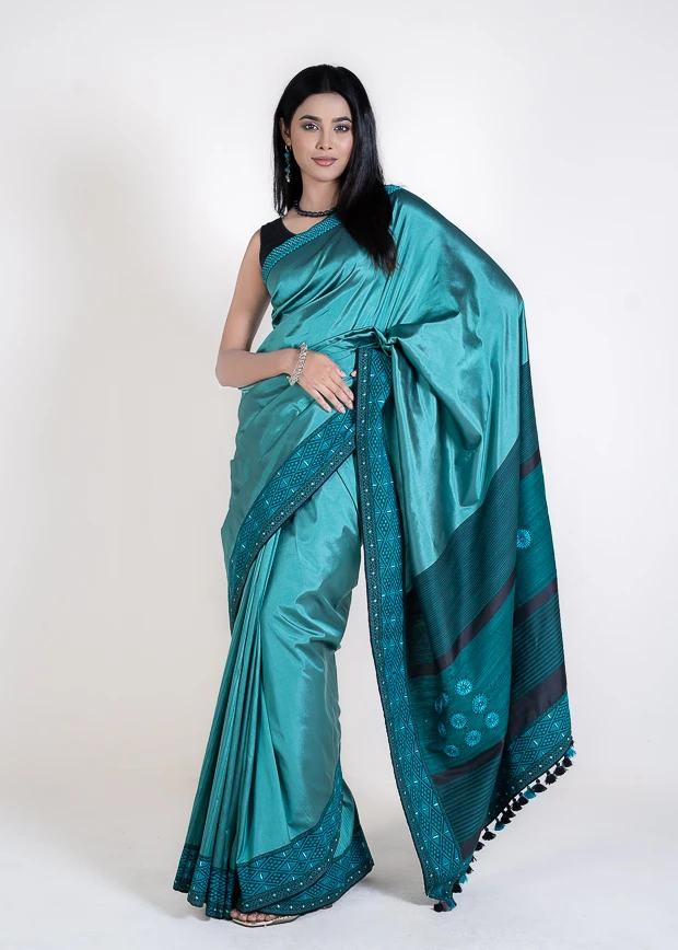 Elevate your festive wardrobe with this exquisite teal Nakshi saree, adorned with intricate all-over handcrafted embroidery. The rich silk fabric and detailed traditional designs make it perfect for weddings, festive occasions, and special celebrations. A timeless piece that showcases craftsmanship and elegance, ensuring you shine at every event.