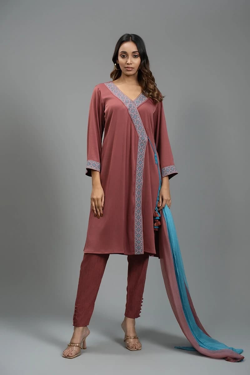 Refined and elegant, this Cranberry Juice color kamiz is designed to deliver a premium look for special occasions. Featuring delicate work on the placket, it adds a touch of sophistication to its rich, vibrant tone. The outfit comes with a perfectly matching bottom that enhances its coordinated appeal. A beautifully blended Sky and Cranberry Juice color dupatta completes the ensemble, creating a graceful contrast that elevates the overall style with timeless charm.