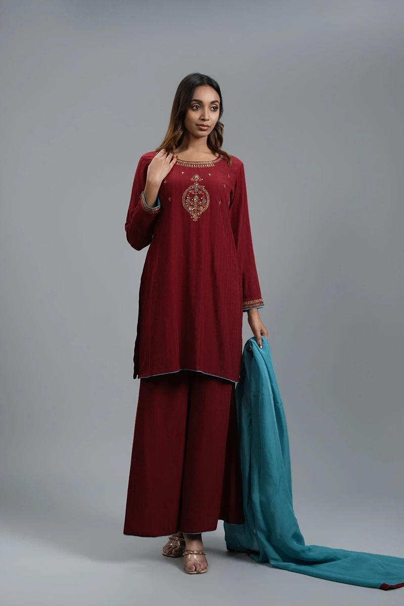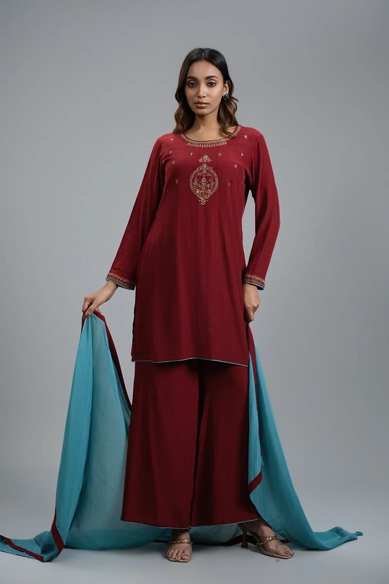 Make a statement with this premium Crimson Red Kamiz, designed to exude elegance and sophistication. Featuring exquisite hand work on the front, it adds a touch of artisanal charm to a timeless silhouette. Paired with a perfectly matching bottom, the ensemble is complemented by a soft sky blue dupatta, creating a striking color contrast. Crafted for a refined, premium look, this outfit is perfect for special occasions, festive celebrations, or any event where style and grace are a priority.